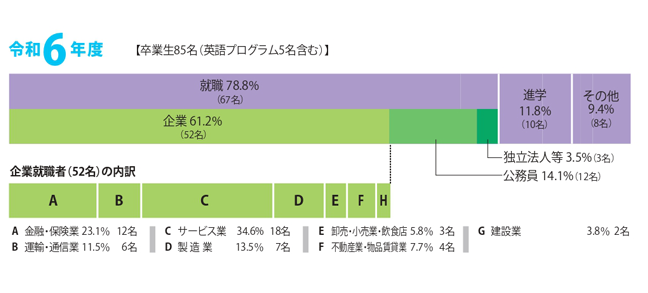 最近の傾向でみると、就職する者が約7割に達し、その就職先は多岐にわたります。特に金融、サービスならびに製造業分野に強く、多くの人材を輩出してきました。また公務員の道を選ぶ者も多くいます。一方、大学院進学や司法試験・公認会計士などの資格試験の準備をする者もおり、将来、研究職や高度な専門職につく卒業生も少なくありません。